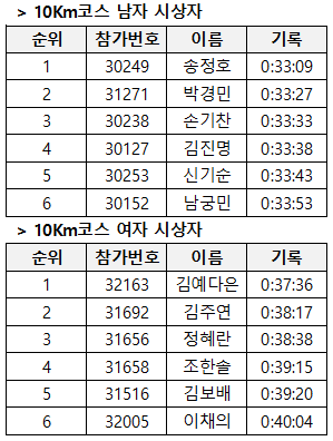 | 77 | 공지 10Km코스 순위 시상자 안내 | 운영자 | 10:45 | 11 |